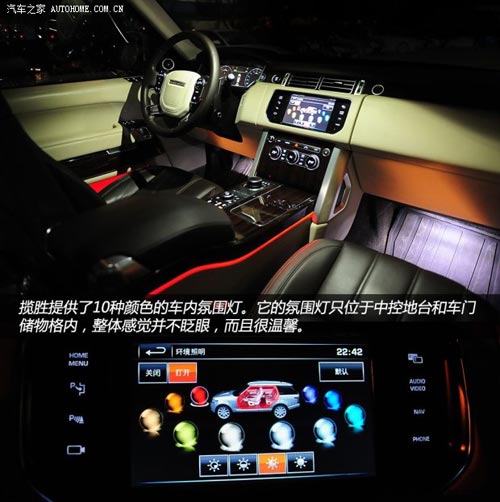 還記得奔馳S級轎車自帶的7種顏色的氛圍燈嗎?路虎的工程師比奔馳還要更加瘋狂,他們為新一代攬勝一下子提供了10種顏色的車內氛圍燈,而且還能夠調節明暗,不過這些氛圍燈攬勝運動版并不具備。