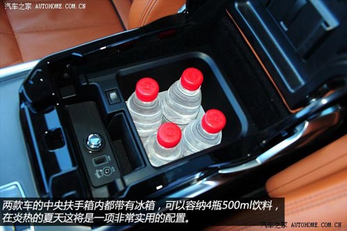 在介紹儲物格之前,中央扶手箱內的冰箱有必要像大家展示一下。這個冰箱的容積著實不小,它可以冷藏四瓶礦泉水,夏日炎炎時可以同時滿足車內四名乘客的需要。