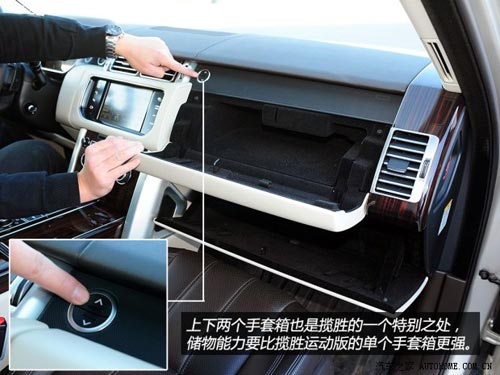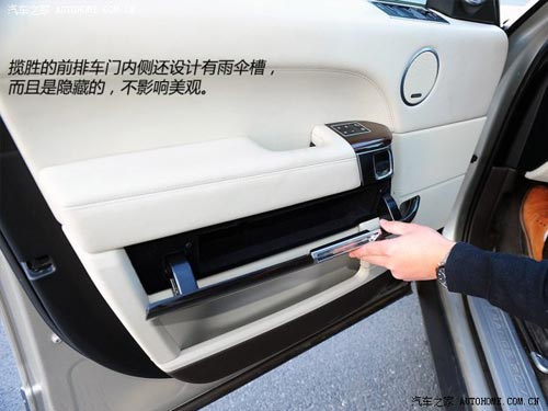 攬勝大部分儲物格與攬勝運動版相同,不過除此之外,它還多了一些儲物格,更加合理地利用了車內空間。例如,它的前排車門設計有雨傘槽,中控手套箱也是分上下兩層的。