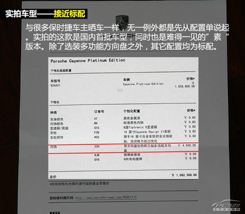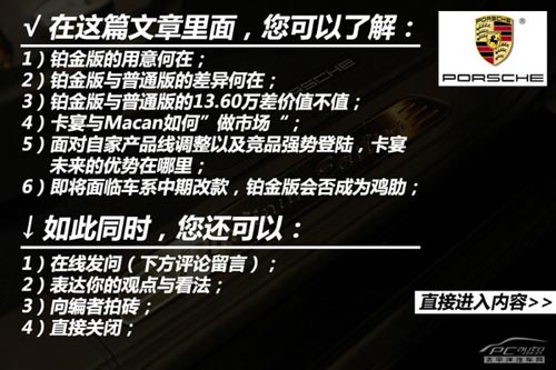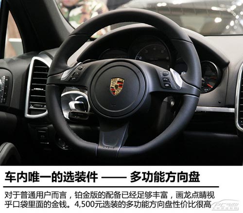 目前國內(nèi)市場所銷售的卡宴為2011款,歷經(jīng)3年的磨練之后,終于繼卡宴GTS之后推出卡宴Platinum Edition(俗稱鉑金版)。保時(shí)捷的鉑金版配置,最先出現(xiàn)在旗下帕納美拉(Panamera)上,其代表精益求精的升華產(chǎn)品,差異化在于加入專享定制化配置。難道卡宴走的也是這個(gè)路線?非也。用更準(zhǔn)確的詞語來說的話,它是取代2011款卡宴3.0T(下稱:普通版)的小改款。