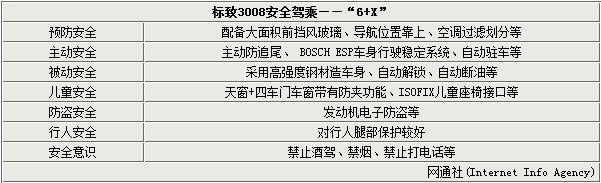 在國內C-NCAP對東風標致所產3008車型進行了碰撞測試,其成績達到58分,已超過五星評級的最低標準8分(≥50為五星評級)。而東風標致所提倡的“6+X”安全理念,則是3008車型取得高分的必要條件。其中數字6則指括預防安全、主動安全、被動安全、兒童安全、行人安全和防盜安全,而X則代表駕乘人員的安全意識。