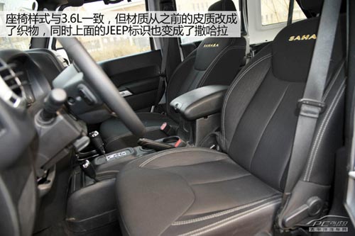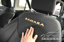 座椅樣式雖然沒有太大的變動,但在材質(zhì)上由之前的真皮變成了織物,因此坐上去感覺要比3.6L版本柔軟度更好,同時LOGO也有之前Jeep變成了Sahara。