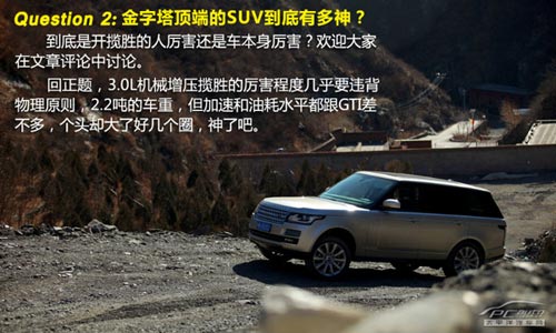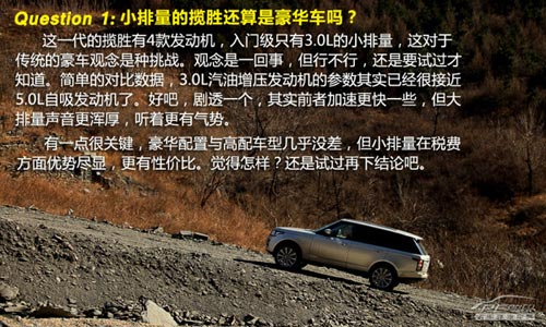 零死角的強者 深度評測2014款路虎攬勝3.0T 最后編輯:2014-3-27 9:32:00 來源: 作者: 全國 再來看看之前文章的網友聲音,盡管多數人買不起,不過全新攬勝還是非常受關注的車型。 我們從之前文章的網友評論里找出幾個典型問題,在此一并解釋。現款的攬勝提供了4款動力總成,分別為3.0L渦輪增壓柴油發動機,3.0L機械增壓發動機,5.0L自然吸氣發動機,5.0L機械增壓發動機,車輛的售價也按著這個排量順序逐級遞增。不難看出,3.0T機械增壓車型在價格上是最有競爭力的,那到底動力夠不夠用呢?這就是本文要告訴你的。嚴重同意!不過話說回來多少錢就完美了呢?人人都買得起,就不是攬勝了。123下頁 責任編輯:管理員