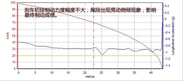 剎車過程中,全程車身前傾現象不是很明顯,但在剎車至尾段時車身開始出現小幅度的搖擺側傾情況,最終測得制動平均成績為44.67米。