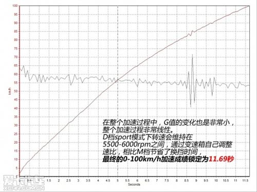 經過幾次嘗試,我們發現M檔需要四次換擋破百,且每次換擋轉速從6000回落到4500,較多的換檔次數影響了鋒馭的加速時間;而D檔sport模式下轉速會維持在5500-6000rpm之間,變速箱會自己調整速比,相比M檔節省了換擋時間,最終的0-100km/h加速成績鎖定為11.69秒。