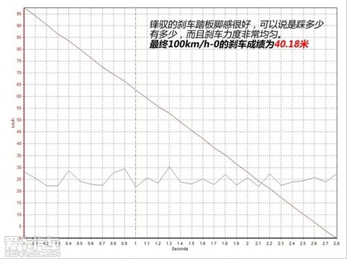 在100km/h-0的剎車測試中,鋒馭的剎車踏板腳感很好,可以說是踩多少有多少,而且剎車力度非常均勻。另外較硬的懸掛對于車身的支撐到位,使得鋒馭在全力剎車時保持了良好的車身姿態。