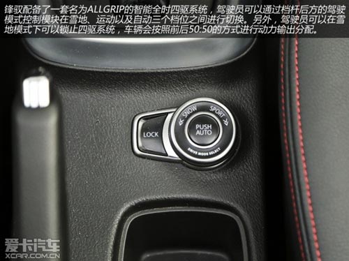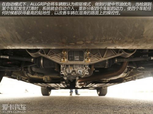 在自動模式下,ALLGRIP會將車輛默認為前驅模式,做到行駛中節油優先,當檢測到某個車輪發生打滑時,系統就會自動介入,重新分配四個車輪的動力,使四個車輪任何時候都獲得最高的貼地性,以改善車輛在濕滑的路面上的操控性。另外,駕駛員可以在雪地模式下可以鎖止四驅系統,車輛會按照前后50:50的方式進行動力輸出分配。