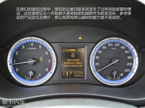 在第一個測試環節,我們將車輛置于測試臺上,模擬左前輪打滑的狀態。掛入D檔并踏下油門之后,鋒馭的這套四驅系統迅速檢測到車輪打滑情況,在發動機轉速受到限制前就擺脫了困境。