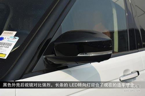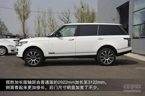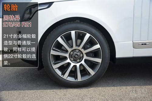 攬勝加長版軸距由普通版的2922mm加長至3122mm,側面看起來更加修長,后門尺寸明顯加寬了不少。側面三片式鯊魚腮底部有個"L"字母標識,這也是與標準版身份區別的唯一標志。后視鏡造型拋棄了方正硬朗的造型,變得更加圓潤,新增的LED轉向燈也迎合了現在的造車理念。21寸的多幅輪轂造型與普通版一致,同樣可以提供22寸輪轂的選裝。