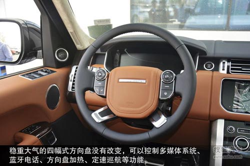 攬勝加長版在內飾設計上也沒有進行改變,全新的馬鞍棕色配色十分顯眼。而整個內飾無論觸感還是視覺效果都堪稱一流,充分的向你詮釋"豪華"的定義。穩重大氣的四幅式方向盤沒有改變,多功能控制鍵的數量更少,操作更加簡單,可以控制多媒體系統、藍牙電話、方向盤加熱、定速巡航等功能。TFT-LCD液晶屏幕模擬的儀表盤,是我最喜歡的配置,現代感和科技感十足,這里也能很多車輛的實時信息,這對于在復雜的越野路面上駕駛是十分有用的。