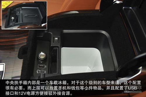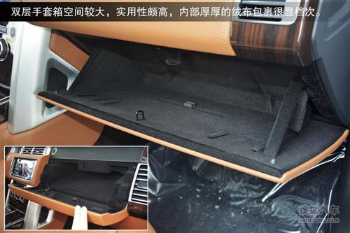 雙層手套箱空間較大,實用性頗高,內部厚厚的絨布包裹很顯檔次。中央扶手箱內部是一個車載冰箱,對于這個級別的車型來說,這個配置很有必要。而上層可以放置手機和錢包等小件物品,并且配置了USB接口和12V電源方便接駁外接音源。新攬勝依然采用上下分段式開啟的尾門,并且可以電動開閉,既簡單方便,又能坐在后備箱地板上看風景。后備廂空間依舊寬敞,并且非常平整,全家出游也不必擔心載物空間。