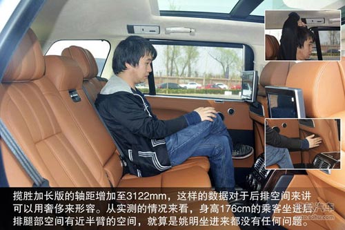 攬勝加長版的座椅依舊厚重, 坐上去感覺十分舒適,并且還會配備有帶記憶功能的電動座椅調節,以及座椅加熱功能等。攬勝加長版的軸距增加至3122mm,這樣的數據對于后排空間來講可以用奢侈來形容。從實測的情況來看,身高176cm的乘客坐進后排腿部空間有近半臂的空間,就算是姚明坐進來都沒有任何問題。