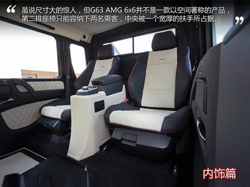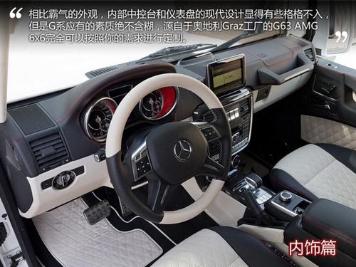 相比霸氣的外觀,內飾自然需要與眾不同才能博得眼球,穩(wěn)重的配色和傳承的布局不用多說,中控臺和儀表盤的現(xiàn)代化設計同外形似乎有些格格不入,但是G系列應有的素質絕不含糊:源自于奧地利Graz工廠的G63 AMG 6x6完全可以按照你的需求進行定制,各種顏色的內飾和面料都可以成為你的選擇。