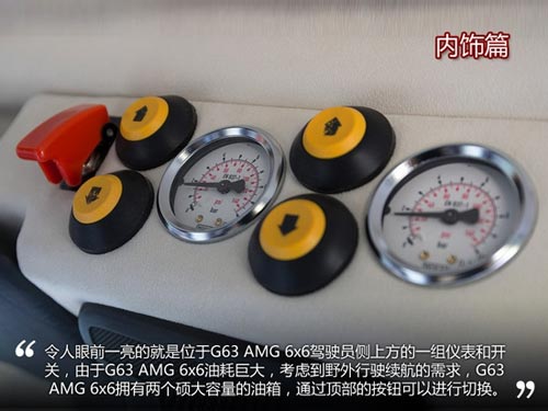 令人眼前一亮的就是位于G63 AMG 6x6駕駛員側上方的一組儀表和開關,由于G63 AMG 6x6的油耗巨大,并且考慮到野外續(xù)航的需求,G63 AMG 6x6擁有兩個碩大容量的油箱,通過頂部的按鈕可以進行切換。
