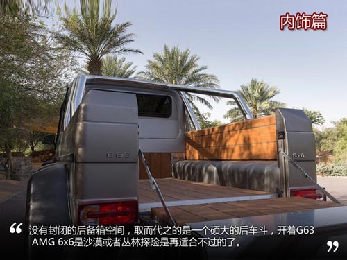 雖說尺寸大的驚人,但是G63 AMG 6x6還真不是一款以空間著稱的產(chǎn)品,第二排座椅只能容納下兩名乘客,中央被一個寬厚的扶手所占據(jù),沒有封閉的后備箱空間,取而代之的是一個碩大的后車斗,開著G63 AMG 6x6是沙漠或者叢林探險是再適合不過的了。