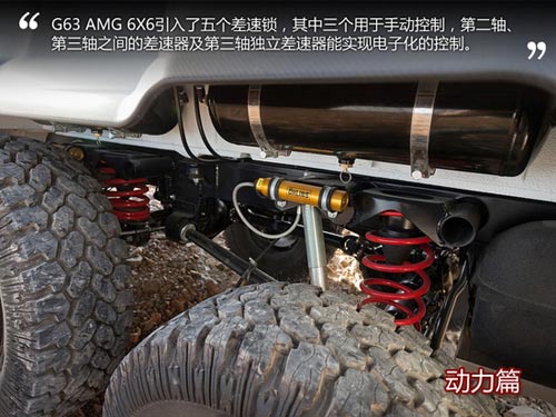 上文提及,G63 AMG 6X6破天荒的引入了五個差速器鎖止的功能,其中三個差速器由用戶手動控制,位于第二軸、第三軸之間的差速器及第三軸獨立差速器能實現電子化的控制,無需進行手動干預,在正常情況下,三軸分配的動力為30:40:30,并且通過鎖指功能,可以把所有扭矩都輸出至指定的車輪甚至是唯一的車輪,堪稱極致越野車。