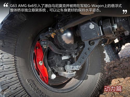 為了進一步提升性能,更好的保持車身穩定性,G63 AMG 6x6引入了源自于烏尼莫克并被用在軍規G-Wagon上的懸浮式整體橋非獨立懸架系統,可以讓車身更好的保持水平姿態,不會受到路面的變化而傾斜。源自軍用版G級上的專用的前輪強化彈簧讓舒適性進一步增強,同時第三軸的減震系統要比第二軸更加柔軟一些,目的也是為了提升舒適性,增加越野能力。