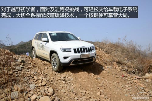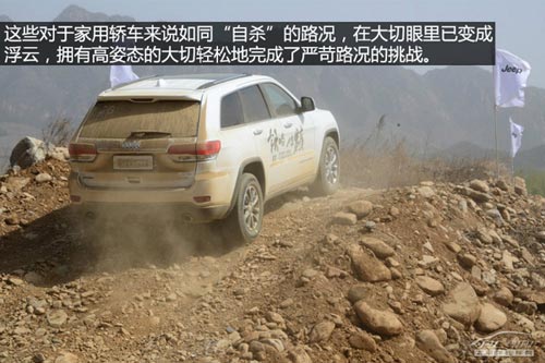 在爬坡過程中,駕駛大切諾基完全不用擔心輪子會被陡坡抬起,因為大切諾基的懸掛行程實在夠長,它可以非常輕松的把輪子押回路面,你所需要做的就是避開尖石,修正好行車路線即可,非常輕松。