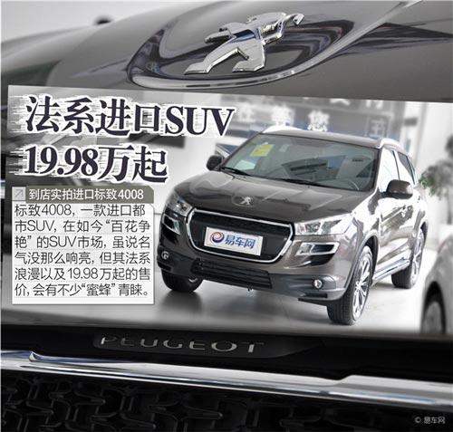 時下的SUV市場,從過去的"一枝獨秀"到如今的"百花爭艷",過去的"一枝"指的就是合資品牌SUV,如豐田RAV4、本田CR-V、大眾途觀等;如今的"百花",盡管合資品牌依舊耀眼,但自主品牌及純進口SUV開始了"含苞待放",甚至有些有"艷壓群芳"之勢,如長城哈弗系列。當然,"百花爭艷",美的是消費者,愁的是廠家,如今除了產品的不斷革新,價格也在不斷地下探,特別時下的SUV市場,從過去的"一枝獨秀"到如今的"百花爭艷",過去的"一枝"指的就是合資品牌SUV,如豐田RAV4、本田CR-V、大眾途觀等;如今的"百花",盡管合資品牌依舊耀眼,但自主品牌及純進口SUV開始了"含苞待放",甚至有些有"艷壓群芳"之勢,如長城哈弗系列。當然,"百花爭艷",美的是消費者,愁的是廠家,如今除了產品的不斷革新,價格也在不斷地下探,特別是純進口SUV車型,優惠幅度越來越大,新上市的車型價格更沒那么高不可攀。接下來介紹的這款法系進口SUV--標致4008就是如此,起售價還不足20萬(官方指導價19.98萬至27.98萬)。