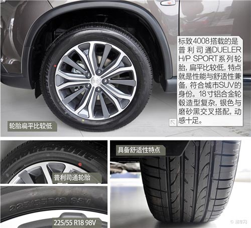 標致4008搭載的是普利司通DUELERH/PSPORT系列輪胎,扁平比較低,特點就是性能與舒適性兼備,符合城市SUV的身份,輪胎尺寸為225/55R1898V,18寸鋁合金輪轂造型復雜,銀色與磨砂黑交叉搭配,動感十足。