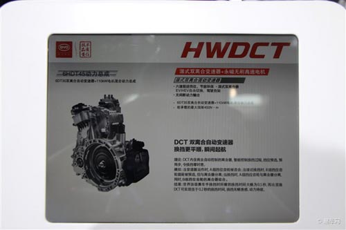 比亞迪官方標稱唐匹配的是一款6速手自一體變速器6HDT45。經過我們核實,比亞迪唐上裝備的6HDT45變速箱是以裝備6DT35濕式6速雙離合為基礎,再匹配一個110kW電機而成的全新變速箱。此款變速箱可以承受450Nm的最大扭矩。