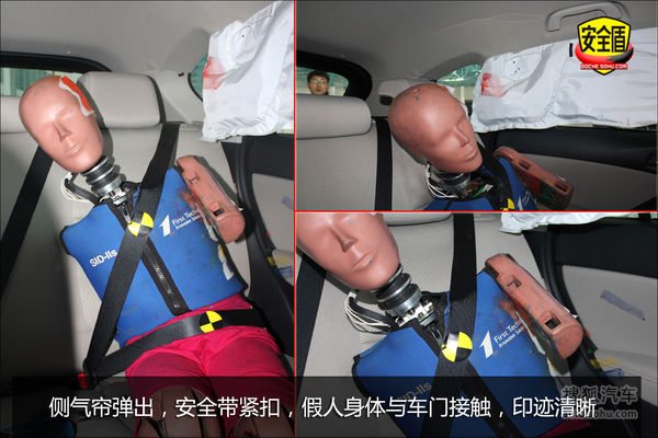 碰撞過程中,后排假人碰撞期間運(yùn)動幅度較大,身體與內(nèi)飾板接觸,痕跡清晰;安全帶緊扣,假人具體的受傷情況還需等待試驗結(jié)果。從實驗現(xiàn)場來看,無明顯扣分跡象。