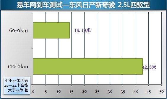 如果只是跑得快而剎不住的話,那豈不是要悲劇了。在100-0km/h的制動實測中,新奇駿的最終制動距離為42.5米,在同級別中競爭對手中體現出了不錯的水平。在全力制動的情況下,車身姿態并沒有很夸張,只是稍微出現了點頭的現象。