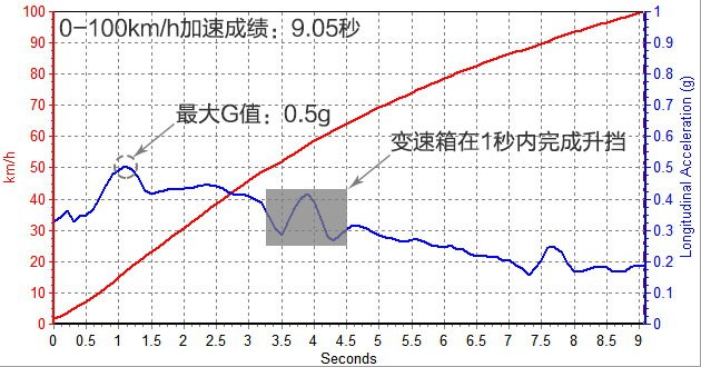 加速測試中,車輛在起步階段沒有迅速推出,而是有一個短暫的停滯。發動機的轉速在2600-2700rpm左右,輪胎伴有有輕微的打滑。從車身姿態上看,由于懸掛和避震行程的原因,車輛會出現略微抬頭的現象。最終,0-100km/h的加速成績為9.05秒。