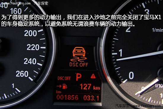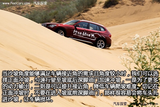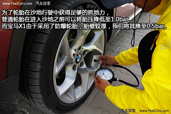 也許熟悉沙漠駕駛的網(wǎng)友們都知道,在進(jìn)入沙漠駕駛之前,我們需要將駕駛車輛的胎壓降低,也就是放掉一部分輪胎中的空氣,增加輪胎與地面的接觸面積,幫助車輛獲得更多的抓地力。普通車輛在進(jìn)入沙漠前需要將胎壓降低至1.0bar,再低可能會(huì)導(dǎo)致輪胎與輪轂出現(xiàn)脫圈的危險(xiǎn)。而由于我們此次試駕的寶馬X1使用了防爆輪胎,在0胎壓情況下也可以在80公里/小時(shí)以內(nèi)行駛近80公里的距離,因此我們?cè)谶M(jìn)入沙漠之前,將胎壓降低至0.5bar。此外,為了獲得更多的動(dòng)力輸出,我們?cè)谶M(jìn)入沙漠之前會(huì)將車身穩(wěn)定系統(tǒng)完全關(guān)閉,以避免系統(tǒng)偵測(cè)到打滑動(dòng)作后進(jìn)行制動(dòng),浪費(fèi)車輛動(dòng)力。另外,沙漠駕駛中的上下車也有一個(gè)小竅門,就是盡量保持單個(gè)車門的關(guān)閉,避免同時(shí)打開兩個(gè)車門之后在車內(nèi)形成對(duì)流,卷進(jìn)沙子。