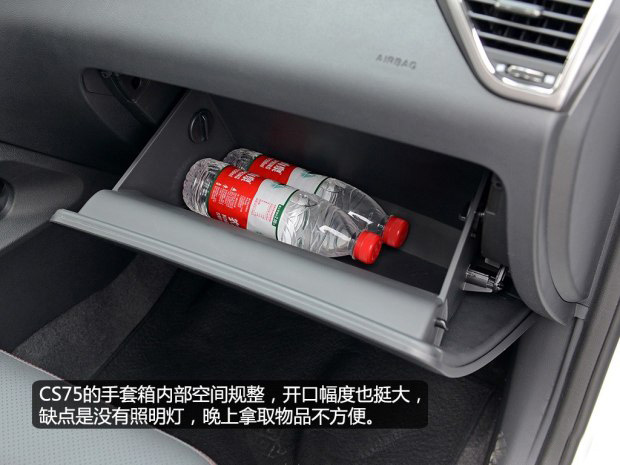 CS75的手套箱空間夠寬敞,而且里面也很規整,但沒有照明燈,在夜晚使用時會感覺不夠方便。中控臺下方的儲物空間夠大,拿取物品很方便。不足之處就是杯架的設計,兩個杯架里面的高低設計不一樣,靠近駕駛員一側的杯架相對較淺,對水瓶的支撐要差一點。這還不是最重要的,關鍵是當放置500mL的瓶裝水時,會影響換擋,手臂剛好會碰到水瓶,感受不是很好。所以,這里的杯架,我們還是建議放置較小的瓶裝水或者聽裝飲料。