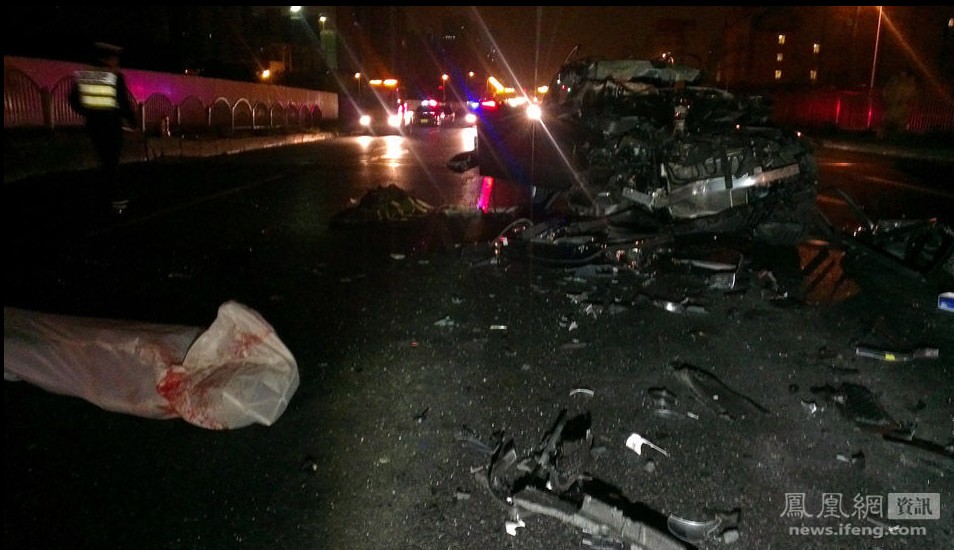 14日清晨5:05左右,上海浦東楊高中路上發(fā)生一起奔馳越野車追尾撞擊平板車的事故,導(dǎo)致奔馳越野車上兩名年輕男女雙雙死亡,兩人年紀(jì)約30歲以下。由于車速較快,猛烈地撞擊使得轎車頭部一頭扎進(jìn)掛車尾部車底,奔馳車車頭嚴(yán)重?fù)p毀,引擎蓋翹起,發(fā)動(dòng)機(jī)扭曲變形,兩只安全氣囊全部彈出掉落地面,前擋風(fēng)玻璃則被伸出平板車的鋼板直接刺穿,現(xiàn)場(chǎng)慘不忍睹。
