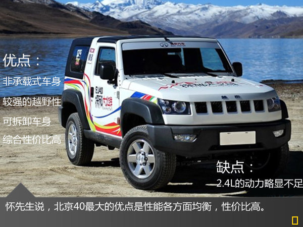 jeep價格太高,入門版車型都要四十多萬,不是太實惠,所以第一個被否決。懷先生說她媳婦挺喜歡哈弗H5,但他認為外觀“太娘”,不夠霸氣,而且越野通過性不高。懷先生自駕游的地方路況都比較差,對車輛性能和通過性要求十分高,之后這輛車也被他否決了。前陣子得知北京40上市,懷先生說他終于可以換車了。
