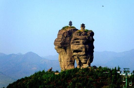 距離避暑山莊西南10千米處,便是承德最大的自然風景旅游區,占地3000公頃。雙塔山風光秀麗,花樹蔥蘢。清人紀曉嵐《閱微草堂筆記》說:山莊之西“有雙塔峰,亭亭對立,遠望如兩浮圖,拔地涌出,無路可上,或夜聞上有鐘磬經唄聲,晝時有云片往來。