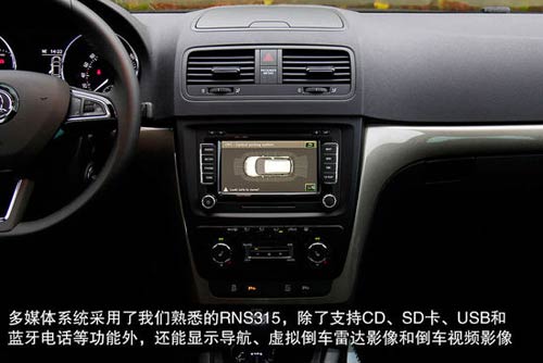 多媒體系統采用了我們熟悉的RNS315,除了支持CD、SD卡、USB和藍牙電話等功能外,還能顯示導航、虛擬倒車雷達影像和倒車視頻影像,而位于下方的雙溫區控制自動空調面板同樣采用的是斯柯達傳統樣式,溫度控制旋鈕上還集成了三檔可調的前排座椅加熱功能。