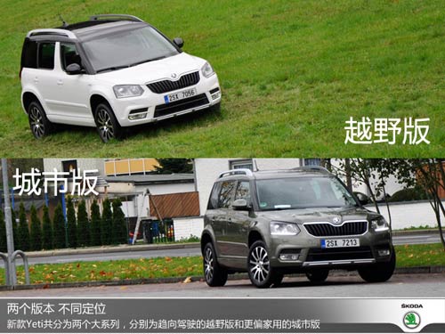 為了更好的定位于SUV市場,斯柯達為新款Yeti準備了兩套“方案”。在車展期間,新Yeti首發了越野版和城市版兩個版本,分別定向于崇尚駕馭激情和追求生活品質的人群。當然兩個版本在外形、驅動方式、配置等方面都有所區別,我們此次試駕的則為1.4TSI城市版高配車型。