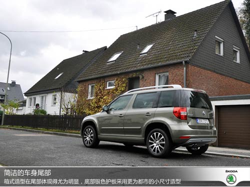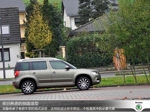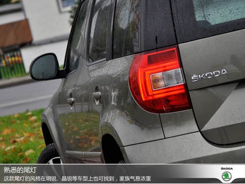 新Yeti在側面造型方面變化不大,箱式造型依舊保留的十分完整。雖然這樣的設計略顯不夠主流,但D柱垂直的風格無疑對車內空間可以起到促進作用。值得一提的是,新款Yeti為消費者準備了6種不同風格的輪轂造型,此次試駕的車型匹配的為米其林輪胎,該輪胎有低噪音、舒適性出色的特點。