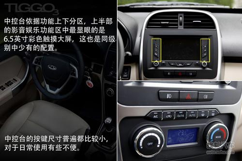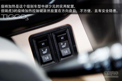 瑞虎3在內(nèi)飾材質(zhì)及亮點(diǎn)配置上都盡心盡力,但細(xì)節(jié)設(shè)計(jì)上的不合理(中控按鍵過小、座椅加熱按鈕位置尷尬、手套箱及扶手箱開關(guān)處沒有添加任何阻尼等)有些拉了瑞虎3的后腿。