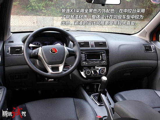 作為一款主打年輕的城市SUV車型,景逸X3內飾的最大特點就是空間超大,這也是它的最大賣點,無論是坐人還是載物都能達到極佳的容納性。景逸X3采用全黑色內飾配色,在中控臺采用了鋼琴漆材質,整體設計在同級車型中較為出色,緊湊的設計風格更受年輕人喜愛,雖然設計不錯但內部都采用硬塑料,使用時觸摸手感不是很好。