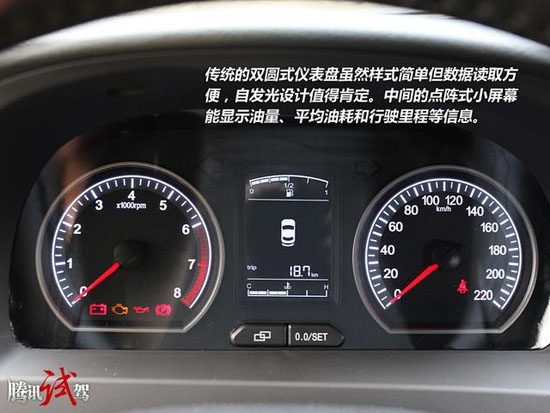 傳統的雙圓式儀表盤雖然樣式簡單但數據讀取方便,自發光設計值得肯定。中間的點陣式小屏幕能顯示油量、平均油耗和行駛里程等信息。