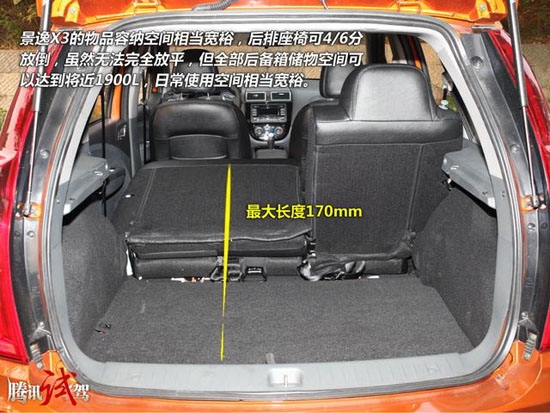 景逸X3的物品容納空間相當寬裕,后排座椅可4/6分放倒,雖然無法完全放平,但全部后備箱儲物空間可以達到將近1900L,日常使用空間相當寬裕。