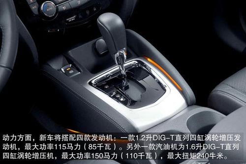 動力方面,全新逍客將搭配四款發動機:一款1.2升DIG-T直列四缸渦輪增壓發動機,最大功率115馬力(85千瓦),最大扭矩190牛米,CO2排放量為129g/km,這款發動機將會取代現款逍客所使用的1.6升自然進氣發動機。另外一款汽油機為1.6升DIG-T直列四缸渦輪增壓機,最大功率150馬力(110千瓦),最大扭矩240牛米,CO2排放量為132g/km。兩款柴油機分別為1.5 dCi和1.6dCi渦輪增壓高壓共軌發動機。