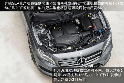 奔馳GLA量產版將提供汽油和柴油兩種發動機,汽油機搭載的將是1.6T發動機和2.0T發動機,其中1.6T發動機根據調教不同,最大功率分別為122馬力和156馬力;2.0T發動機最大功率為211馬力。所有發動機均與七速雙離合自動變速器匹配,并可選配4MATIC四輪驅動系統。此外,奔馳還將推出AMG版的GLA車型,搭載與A45 AMG相同的2.0T發動機。