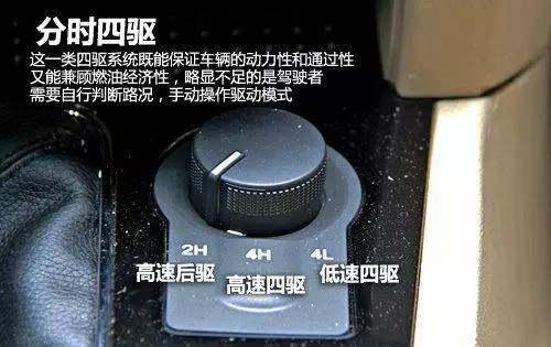 分時四驅是指可以由駕駛者根據路面情況,通過接通或斷開分動器來變化兩輪驅動或是四輪驅動模式,從而實現兩驅和四驅自由轉換的驅動方式。分時四驅平常只利用前輪或是后輪的四輪驅動來行駛,在積雪或石礫路面上能切換成四輪驅動來行使,也叫選擇四輪驅動。這也是越野車最常見的驅動模式。