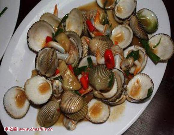 扇貝:貝殼很像扇面,品種分紅、白兩色。烤扇貝味道最好,加醬、蒜蓉粉絲的味濃。紅色扇貝說是野生的,不過吃下來的感覺和白色的也差不多。在三亞,紅色的一般是13元/斤,白色的15元/斤。